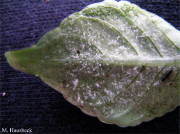 Impatiens downy mildew can spread throughout the landscape. The pathogen produces spore-like structures called sporangia on the lower surface of the leaves of infected plants. These structures can be splashed short distances or become airborne and travel long distances on moist air currents and spread the infection. It only takes about four hours of a wet leaf surface for sporangia to form. Under hot, dry conditions, infected plants may not show symptoms of disease and produce sporangia on the lower leaf surface.