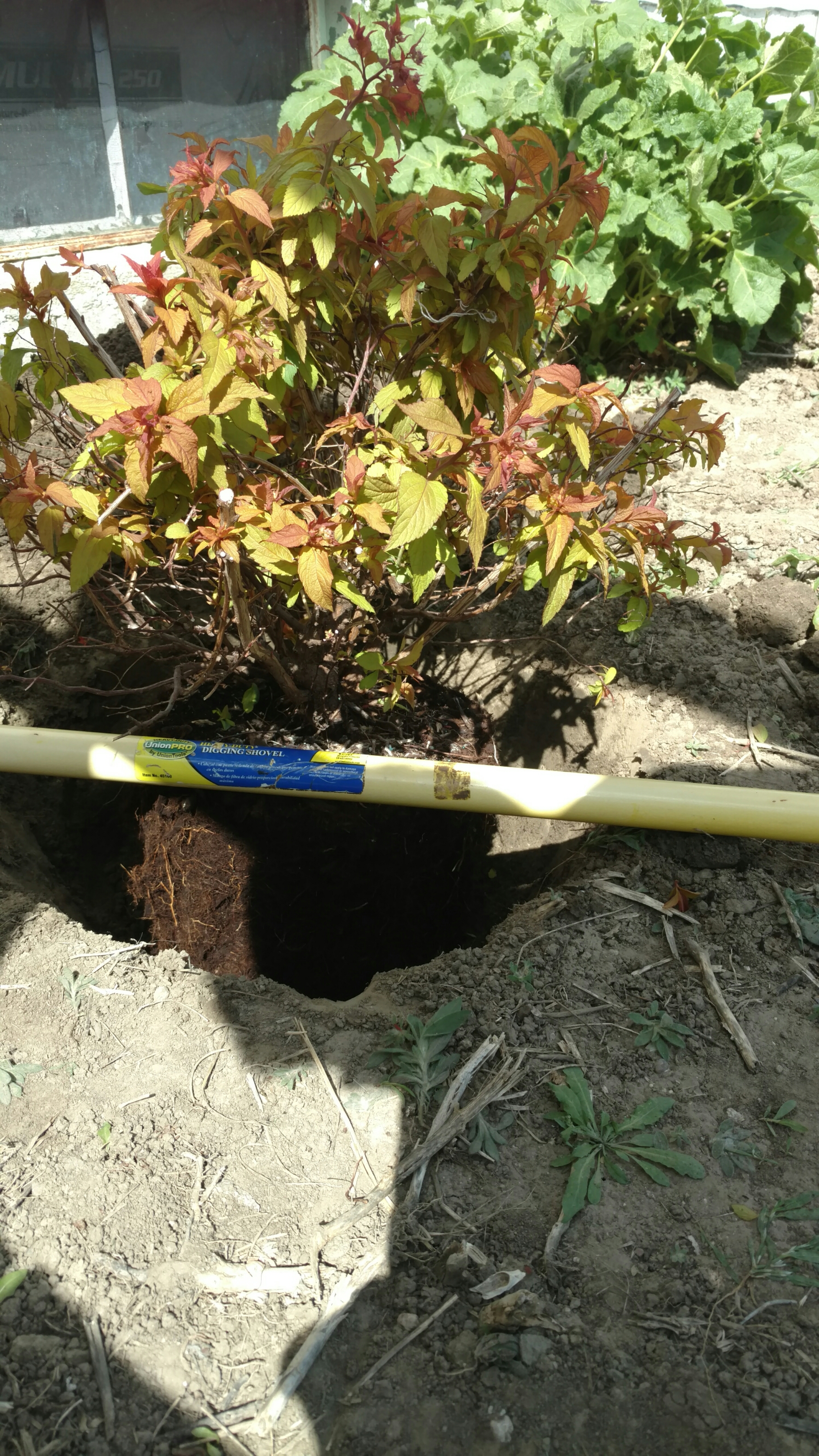 Then it was time to place the plant in the hole. Made sure the plant was planted at about the same depth as in the pot. Used a shovel handle to see how I did. Then it was time to backfill with the original soil and water.
