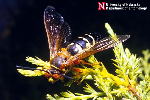 Cicada killer wasps have a frightening name, but that is about all. These wasps are by far the largest wasp species in Nebraska, up to two inches long. Their black bodies have a yellow stripe color pattern that is similar to other wasps. Cicada killers, like their name implies, hunt cicadas, sometimes known as locusts. They listen for the cicadas to sing then attack and sting to paralyze them. They carry the paralyzed cicadas to their underground burrows where the female cicada killer will lay her eggs on it. When the eggs hatch, the wasp larvae feed on the cicada.